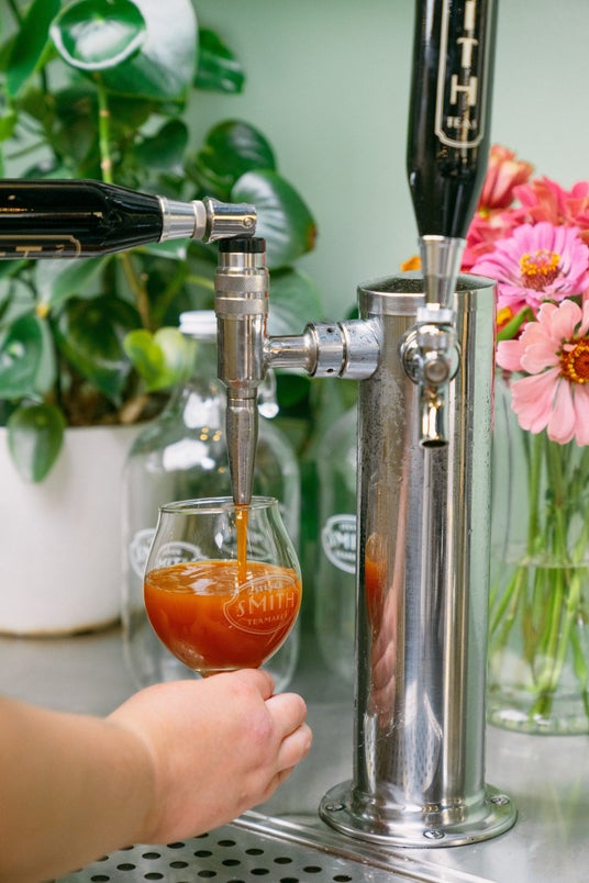 SMITH TEAMAKER の「TEAS ON TAP」は、クラフトビールのサーバーを使用し、茶葉の個性を最大限に引き出す新しいスタイルのティー提供方法です。炭酸ガス(CO2)または窒素(NO2)を注入することで、きめ細やかな泡立ちとともに、茶葉の香りや風味を一層際立たせます。