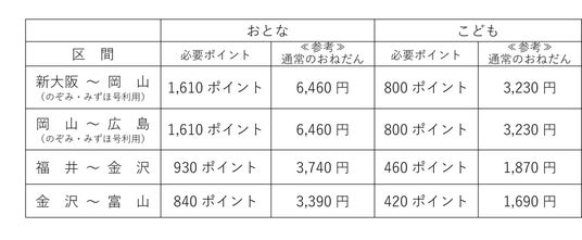 今回は山陽新幹線に加えて北陸新幹線(糸魚川~敦賀間)も対象に。さらに、ご利用に必要なWESTERポイント数を通常のおねだんの約25 %相当のポイント数とし、もっとおトクにご利用いただけるようにしました!