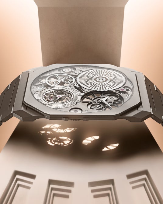 古代ローマの遺産から力を得たブルガリの「オクト」は、ヘリテージ建築の歴史の一部と言えます。オクタゴン(8角形)は、マクセンティウスとコンスタンティヌスのバシリカの格天井がインスピレーションとなっています。永遠の都ローマと壮麗な歴史的建造物は、1884年にブルガリが始まって以来、つねにメゾンのクリエイティブ アイデンティティの中心的役割を果たしてきました。現代的な視点を通して歴史から引き出された純粋で現代的な「オクト」のヴィジョンは、超薄型の「オクト」のモノクロームなグレーによってさらに強く表現されています。研ぎ澄まされた純粋さを追求したいという想いとラグジュアリーウォッチの真髄が表出した「オクト」により、ブルガリは超薄型ウォッチをウォッチメイキングの最高峰であるコンプリケーションの地位にまで引き上げました。