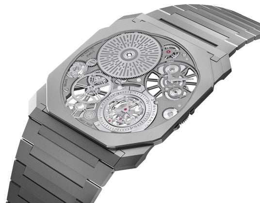 今回ブルガリは新しい「オクト フィニッシモ ウルトラ トゥールビヨン」においてスケルトン化をさらに高いレベルに引き上げ、ムーブメント全体の光の拡散を最大限に高めました。