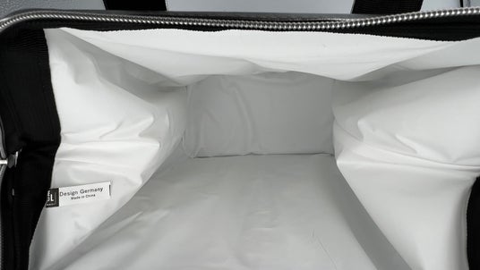こちらはモダンなデザインと豪華なダブルファスナー、贅沢な4つの金具といった、煌びやかな外見とは対照に清潔感あふれる白いPEVA素材を内部に使用し、入れた荷物が見やすくなっています。そして大きな開け口と底敷があり、自立が可能な本当に使える商品となっております。また、内部にパッドの入った手持ちハンドル、背負った時に荷物が最適なバランスになるよう、人間工学に基づいたショルダーストラップ、とPLUS X AWARD審査員がかなりの割合を割いてこの商品をレポート、評価しています。