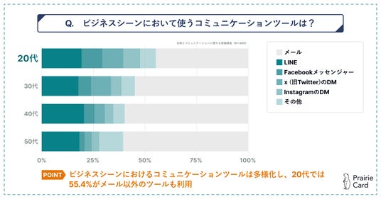 1.ビジネスシーンにおけるコミュニケーションツールは多様化し、20代では55.4%がメール以外のツールを利用