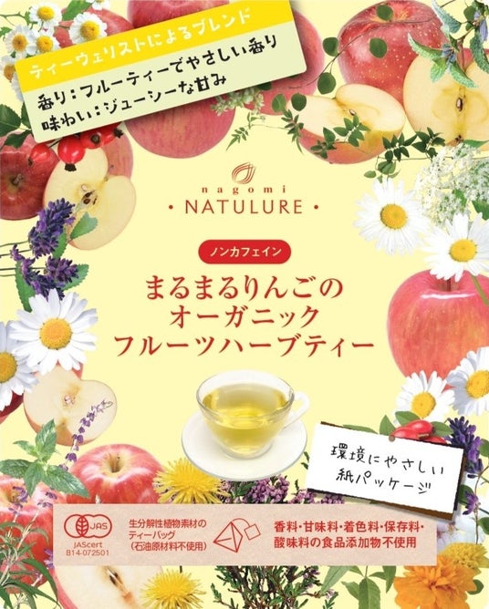 有機栽培のりんごを皮ごとまるまる使用したジューシーでフルーティーな味わいに、カモミールの自然な甘みとやさしい香りが広がる一杯です。