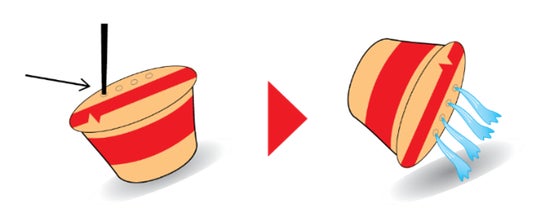 2.熱湯を麺がかくれるまで(約400ml程)入れ、3分後、フタ上部の2.湯切り口の点線部分にお箸を刺して穴を開け、カップをゆっくり傾けてお湯を捨てる。