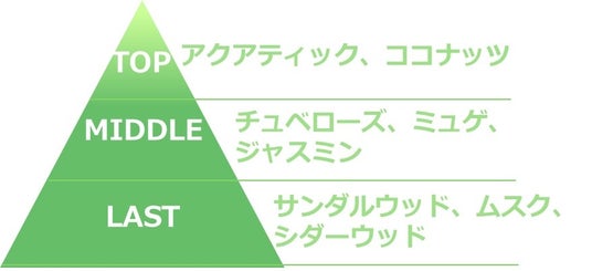 ココナッツや、ジャスミンなどのフローラルの優しい甘さと、温かみを感じさせるウッドが調和した香り。