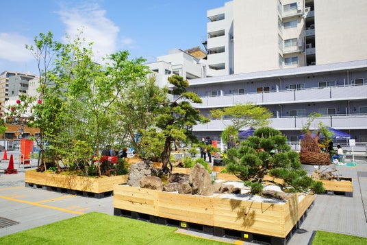 造園家たちのインスタレーション作品が駐車場の屋上(エム・パーク)にずらりと並ぶ