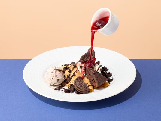 ビッグパフェとクレープは、ダークチェリーの果肉が入った甘酸っぱいチェリーソースと一緒にご提供します。濃い赤紫色のソースがデザートをより大人な印象の色味に変化させ、ちょっぴりアメリカンな味わいをお楽しみいただけます。