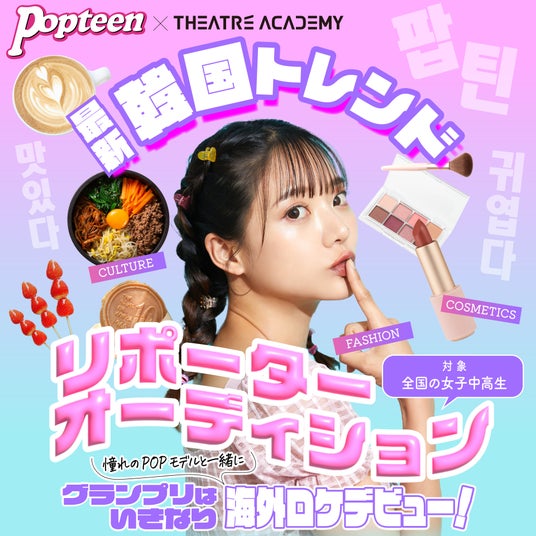 鈴木福・齋藤潤をはじめとする俳優のほか、内田蓮・鎌田英怜奈などモデルとして活躍中のタレントも数多く輩出しているテアトルアカデミーが、Popteenとのコラボオーディションとして『テアトルアカデミー×Popteen 最新韓国トレンドリポーターオーディション』を開催いたします。
