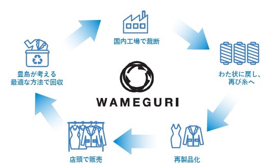 豊島では、日本で供給されるアパレル製品の2~3%にあたる量を生産している背景から、処分される衣料66%に対して、自社で責任の一端を担うことができないかと考え、日本国内で廃棄された衣料品を再循環させるプロジェクト「WAMEGURI(ワメグリ)」を2022年1月に始動しました。