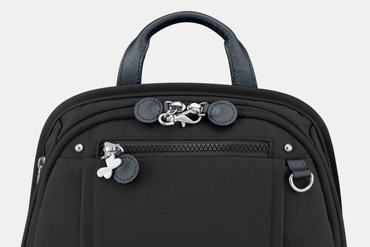 メイン収納部のファスナーに不用意な開閉を防ぐセーフティーロックを、常に背中と接するリュック背面に貴重品を入れられるセキュリティポケットを配置しました。通帳やパスポートといった貴重品の収納に適しています。