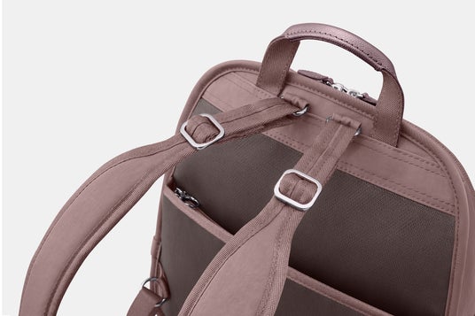 リュック上部はスリムに、下部はしっかりとマチ幅を設けることで、見た目の印象以上にたくさんの荷物を収納できます。内装に中身が見えるメッシュポケットや、折り畳み傘を差し込めるホルダーなどの多彩なポケットを配置しました。