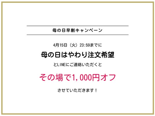 さらに、4月15日までに「母の日早割注文希望」とLINEでご連絡いただければ、1000円オフになるキャンペーンも実施中です。