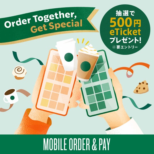 『THE 苺 フラペチーノ(R)』の発売にあわせて、「Order Together, Get Special」のキャンペーンを実施します。4月9日(水)から5月27日(火)までの期間中、「Mobile Order & Pay」(以下、モバイルオーダー)を友人や家族に紹介し、紹介された方が初めてモバイルオーダーを利用すると、紹介した方、紹介された方それぞれに、抽選で1万名様(合計2万名様)に500円分のeTicketをプレゼントします。