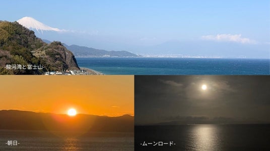 「オーナールーム」の最大の魅力は、開放感あふれる圧巻の眺望です。晴れた朝には、東の空を染めながら昇る朝日が海面を煌めかせ、夕暮れ時には西の空が黄金色に輝く中で、一日が穏やかに終わりを迎えます。また、南側には広大な駿河湾が広がり、北側には霊峰・富士山を望む壮大な景色が広がります。さらに、満月の夜には駿河湾に映るムーンロードがその美しさを一層際立たせ、心を打つ感動的な光景を楽しむことができます。