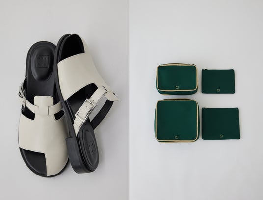 Thumb leather flat sandal ¥28,050(tax in),Original travel pouch 4set ¥17,600(tax in)