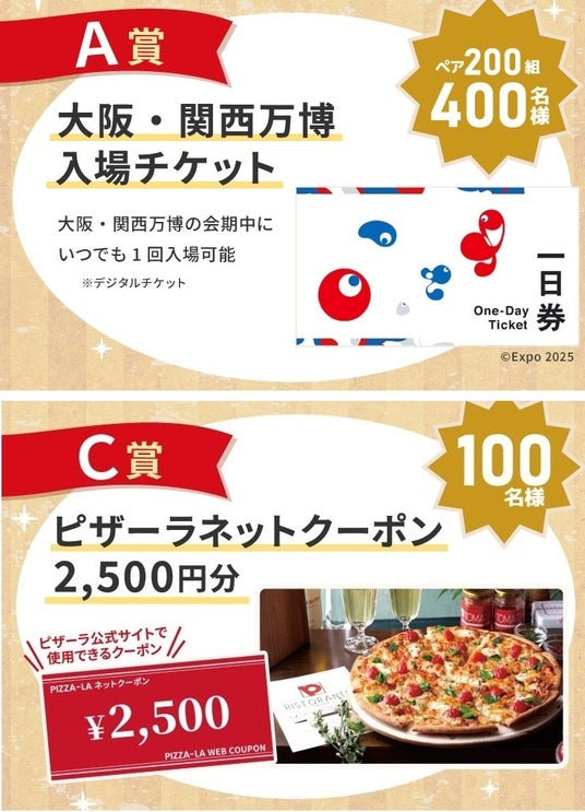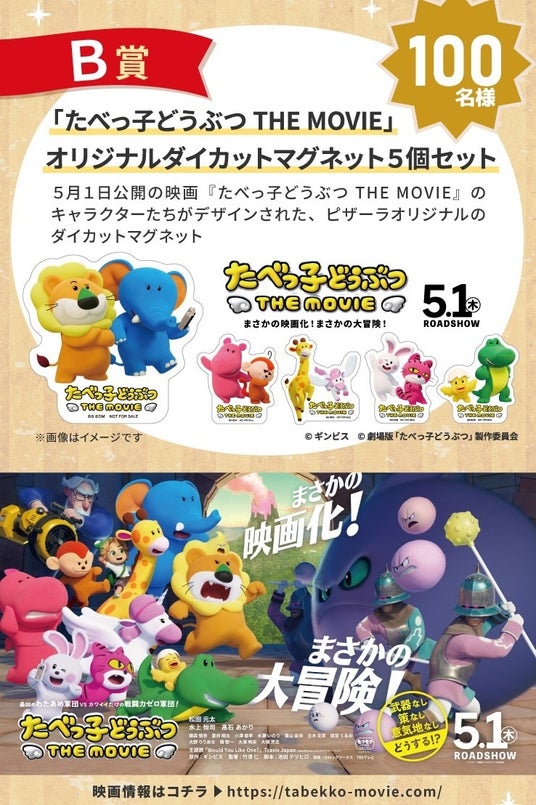 ピザーラの商品をご注文いただき、ご応募いただいた方の中から抽選で、「大阪・関西万博」入場チケット、「たべっ子どうぶつ THE MOVIE」オリジナルダイカットマグネット、「ピザーラ」2,500円分ネットクーポンの豪華賞品をプレゼントいたします。