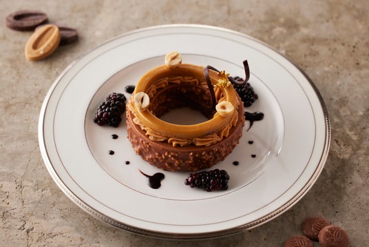 上段には、カカオ52%のほろ苦いブラックチョコレートに、香ばしいプラリネと甘く濃厚なキャラメルを合わせた「チョコレートムース」をご用意。仕上げのグラサージュにはアーモンドを混ぜ込み、食感のアクセントを加えました。プレートにあしらったブラックベリーの酸味が、チョコレートの深みを引き立てます。中段は、世界のトップ・パティシエに愛されるフランスの高級ショコラブランド「ヴァローナ社」のチョコレートを贅沢に使用したラインアップが登場。ヘーゼルナッツ入りのガナッシュクリームをガトーショコラでサンドした「ショコラサンド」には、クッキーのような香ばしさとカカオ56%のほろ苦さが特徴の『カラク』と、カカオ35%のほのかな塩味が魅力の『ドゥルセ』を使用。その他、『カラク』とマスカルポーネを組み合わせた「ショコラタルト」や、「ショコラプティシュー」には上品な酸味のフランボワーズクリームと豊かなコクと香りのピスタチオガナッシュを乗せるなど、シェフが趣向を凝らし、チョコレートの甘み、苦味、酸味といった多様な味わいを最大限に活かしたスイーツを取り揃えています。下段は、バナナとチョコレートで仕立てたスープの「ヴルーテ」や、ダークチョコレート入りのソースを合わせた「合鴨の低温調理とキノコマリネ」、チョコレート入りのマスタードバターを使用したオープンサンドなど、チョコレートの甘みと苦みを巧みに活かしたセイボリーをご用意しました。