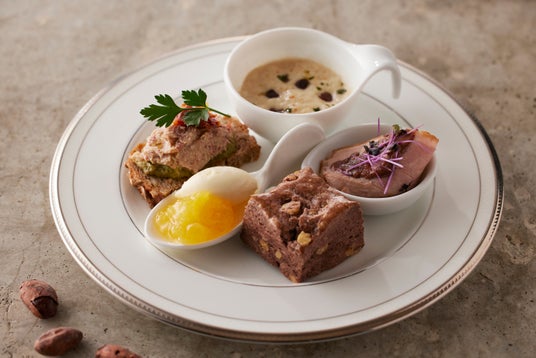 バナナとチョコレートのヴルーテ シナモンの香り/合鴨の低温調理ときのこマリネ チョコペペロンチーノソース/ココアと胡桃のスコーン/クロテッドクリーム&オレンジマーマレード/ポークとコンビーフのリエットとひまわりの種入りライ麦パンのオープンサンド