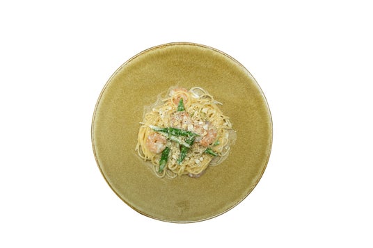 プリプリの小海老とシャキシャキのアスパラガスを、カシューナッツのコク深いクリームソースで包み込んだ贅沢な一皿。