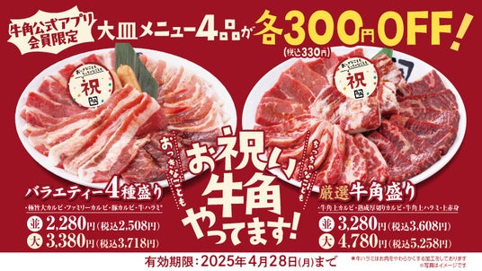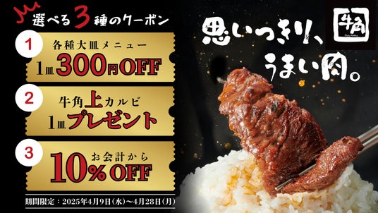 コロワイドグループの株式会社レインズインターナショナルが展開する牛角では、2025年4月9日(水)から4月28日(月)まで、牛角公式アプリ会員様限定で「選べる3種のクーポン」をご用意いたします。