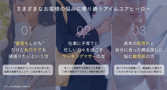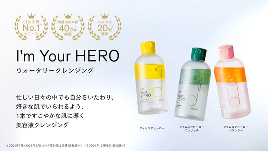 やるべきことが多く、いつも満足のいくスキンケアができるとは限らない多忙な日々の中でも、肌と自分をいたわり、好きになることができたら。そんな思いから誕生した「アイムユアヒーロー デュアルウォータリークレンジング」は、2層のパワーで汚れを「取り去る」ケアだけでなく「与える」ケアも同時に叶える、敏感肌*³のためのヒーロースキンケア発想の美容液クレンジング。発売から約3年半で累計出荷本数は40万本*¹を突破し、20冠*⁴を超えるベストコスメを受賞するなど、これまで多くの方にご愛用いただき、ブランド人気No.1*¹のアイテムに成長しました。