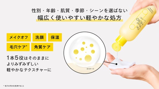 メイクオフから洗顔、保湿、さらには毛穴ケア*²、角質ケアまでを一度に叶える秘密は、約3:7の黄金比からなるオイル×美容液の2層構造。シェイクすることで美容液がオイルを包み込み、不要なメイク汚れや皮脂・毛穴汚れは浮かせてオフしながらも、同時にうるおいを与えます。W洗顔、洗い流しは必要なく、シェイクしてコットンに取り拭き取るだけ。わずか30秒ですこやかな肌に整えます。