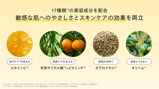 ただ汚れをオフするだけではなく「与える」ケアも同時に叶えるため、軽やかな使用感でありながらも17種類*⁶の美容成分を配合。毛穴ケア*⁷を支えるビタミンC*⁸や、角質ケアを支える天然サリチル酸*⁹・ビタミンP*¹⁰、肌荒れを防ぐポアロイヤル*¹¹など、手軽さ、敏感な肌へのやさしさ、そしてスキンケアとしての効果を両立する美容液設計になっています。