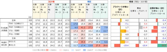 興味深いのは子あり(14歳以上)で、「仕事0~2/PB10~8」「仕事8~10/PB2~0」が共に10pt以上減少し、現在は「仕事3~4/PB7~6」「仕事5/PB5」のゾーンに集中する結果となっています。コロナ禍では仕事とプライベートのバランスが家庭によって様々であったのに対し、アフターコロナで本来のバランスを取り戻したと推測されます。