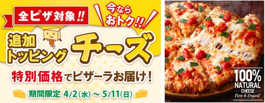 期間限定で追加トッピング「チーズ」が特別価格に!すべてのピザでおトクにたっぷりのチーズをお楽しみいただけます。