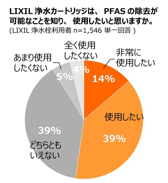 次に、LIXIL浄水カートリッジがPFAS除去できることをお伝えした上での使用意向を尋ねたところ、PFASが心配と回答した方とほぼ同数(53%)が「非常に使用したい」(14%)「使用したい」(39%)と回答しました。
