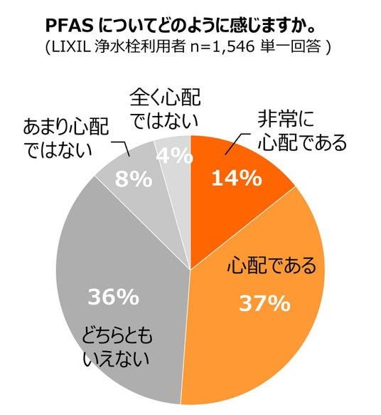 また、近年は自然界には存在しないはずの化学物質、有機フッ素化合物PFAS(ピーファス)が全国各地で相次いで検出され、発がん性や子どもの発育への影響など、人体への有害性が懸念されています。LIXILの浄水器付き水栓を利用している方にPFASについて尋ねたところ(対象:1,546人)、半数以上(51%)が「非常に心配である」(14%)「心配である」(37%)と回答しました。LIXILの浄水カートリッジは、浄水器協会の規格基準(JWPAS B基準)に基づく試験(※2)により、PFOSおよびPFOA(PFASの一種)が80%以上除去できることを確認しています。