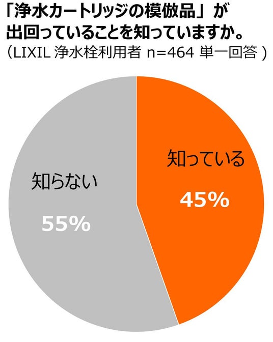LIXILの浄水器付き水栓を利用している方に浄水カートリッジの模倣品について尋ねたところ(対象:464人)、その存在を「知っている」という回答は45%に留まりました。