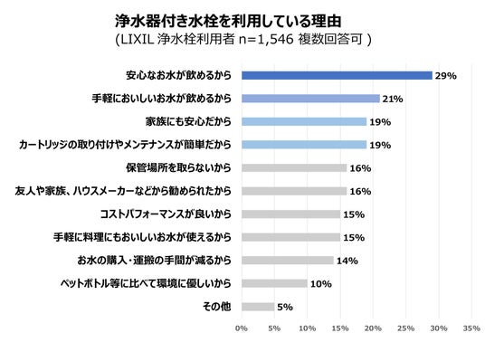 続いて、LIXILの浄水器付き水栓を使用している方に使用理由を尋ねたところ(対象:1,546人)、「安心なお水を飲めるから」という回答が最も多く(29%)、次いで「手軽においしい水が飲めるから」(21%)、「家族にも安心だから」「カートリッジの取り付けやメンテナンスが簡単だから」(各19%)となりました。