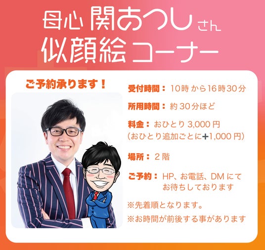 本イベントは、漫才をしながらイラスト制作や似顔絵制作しているお笑い芸人母心関あつし氏による似顔絵コーナーや金魚すくいのように小さい赤べこをすくう縁日コーナーなど大人から子供まで楽しめるコンテンツを用意している。