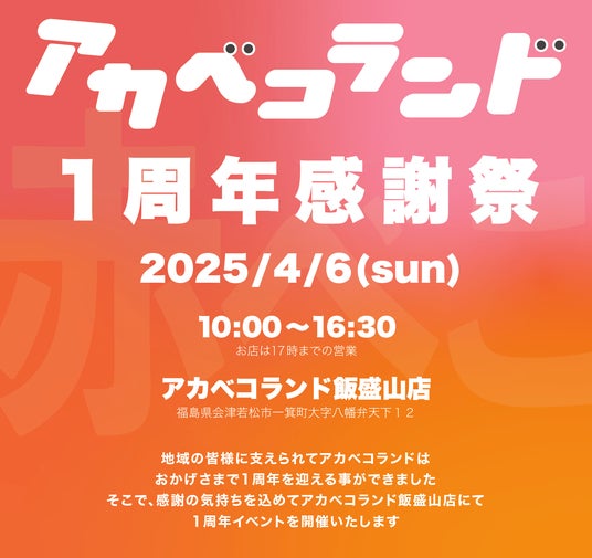 株式会社アカベコランド(福島県会津若松市 代表取締役:渡邊高章)は4月6日にオープン1周年を記念した周年イベントを開催する。