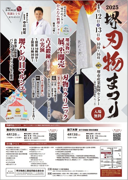 堺刃物まつり実行委員会(構成:堺刃物商工業協同組合連合会、公益財団法人堺市産業振興センター)では、堺の伝統産業である刃物の魅力を発信し、日常生活への一層の普及と刃物産地としてのイメージアップを図ることを目的に、「令和7年 堺刃物まつり」を開催します。