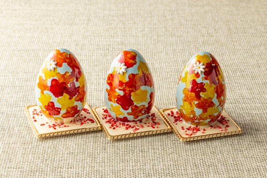 燃え上がる炎や流れ出す溶岩を思わせる鮮やかで情熱的な赤のチョコレートとアーティスティックなライニングが印象的な一品。フランスの名門ショコラメゾン カカオバリー社の高品質ホワイトクーベルチュール「ブランサタン」を贅沢に用い、見た目のインパクトと、繊細で洗練された味わいが共鳴する記憶に残るイースターチョコレートです。