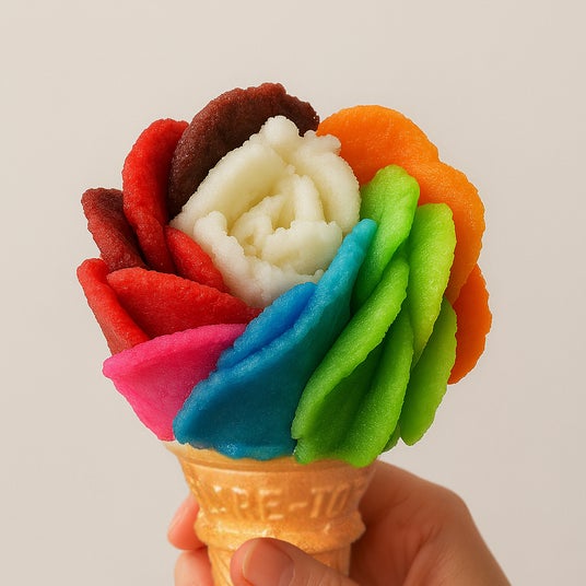 あいぱく(R)初登場!青森県十和田市を中心に、昔ながらのリヤカー販売で親しまれている「チンチンアイス」。カラフルな10色のアイスを花束のように盛りつけ、見た目にも楽しい一品です。地元では「花火アイス」や「虹色アイス」とも呼ばれ、甘すぎずさっぱりとした味わいが特徴。懐かしさと特別感を兼ね備えた、唯一無二のアイスをぜひご堪能ください。