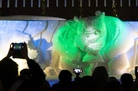 隣接する雪像「マイメロディ50周年&クロミ20周年」(著作:株式会社サンリオ)とのコラボレーションで、初音ミクがカバーした楽曲『KAWAII FESTIVAL』(*2)に合わせたライトアップを行いました。