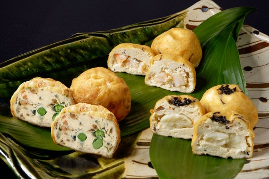 がんも3種セット(海老、百合根、桜海老とグリンピース)うかい豆腐と山芋を合わせ、きくらげや人参を練り込み、ふんわりと仕立てた豆腐の甘みがうれしいがんもどきです。たっぷりと出汁を煮含めてふっくら仕上げ、お好みで生姜やからしを添えてお召し上がりください。とろみをつけた出汁を餡としてかけると味わいが一層引き立ちます。また、トースターで軽く焼き目をつけて、そのままでもお楽しみいただけます。