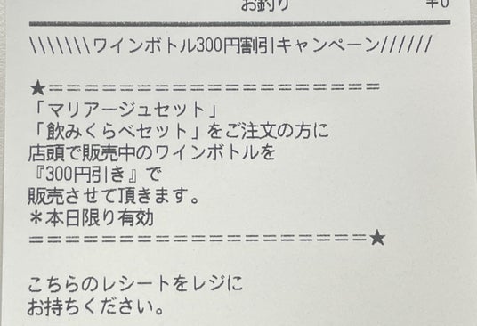 ・特典:「f winery 醸造ワインマリアージュセット」や「f winery 醸造ワイン飲み比べセット」の注文すると、レシートに、ワインボトル(750ml)購入の300円OFFクーポンチケットが付いています。