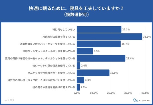 「快適に眠るために、寝具を工夫していますか?(複数選択可)」と質問をしたところ、「冷感素材の寝具を使っている」が最も多く38.3%でした。次に多かったのが「夏用の薄掛け布団やガーゼケット、タオルケットを使っている」で28.4%、3番目には「特に何もしていない」26.1%が続き、工夫をしている人がいる一方でおよそ4分の1の人が特に何もしていないことが分かりました。