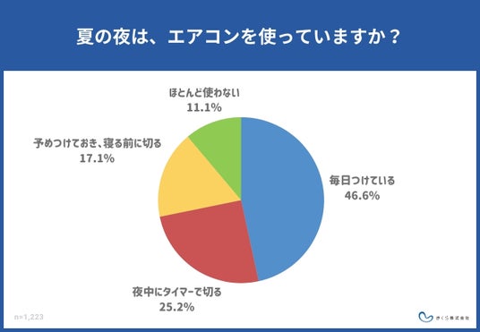 1,223人を対象に「夏の夜は、エアコンを使っていますか?」と質問をしたところ、「毎日つけている」が46.6%と、夏の夜はおよそ半数がエアコンを毎日使用しているという結果となりました。また、「毎日つけている」46.6%に、「夜中にタイマーで切る」25.2%、「予めつけておき、寝る前に切る」11.1%をあわせると74.8%となり、多くの人が夏の夜にエアコンを使用していることがわかりました。