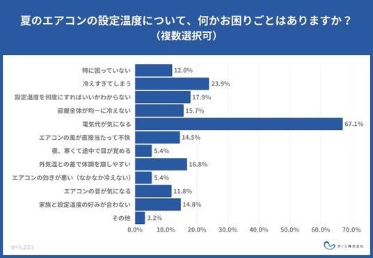 ・夏のエアコン使用における悩み第1位は「電気代」で67.1%。