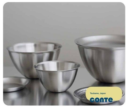 ステンレスのキッチンボウルという、普遍的なアイテムをより使いやすくするためのシリーズ。縦長で場所をとらず、同じサイズを重ねてもはまり込まず、容量は十分にあり、径が狭いので泡立てが早く、汁切れも良い… と、使い勝手のいい機能が美しいプロポーションに集約されています。