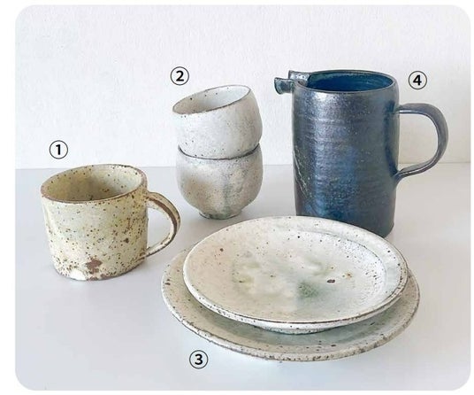 「上田隆之 」1.マグカップ 4,180円 2.丸カップ 各4,180円 3.リム皿 4,620円~ 、「庄司理恵」➃ピッチャー 6,820円
