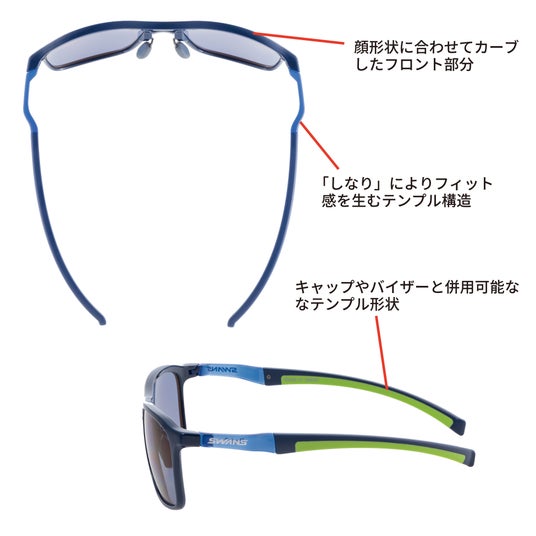 ■隙間なく顔にフィットし、キャップやバイザーとも併用可能なフレームデザイン・頭部形状に合わせてカーブしたフロント部分が、隙間からの光や