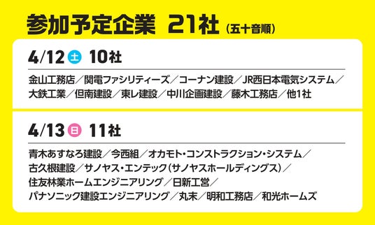 出展企業は、設計やデザイン、施工管理、設備など、様々な職種を募集している21社で、採用担当者と直接話すことができる絶好のチャンスです。企業の担当者から建設業界の最新動向や今後の展望について聞くことができ、職場環境や仕事内容をより深く理解することができます。