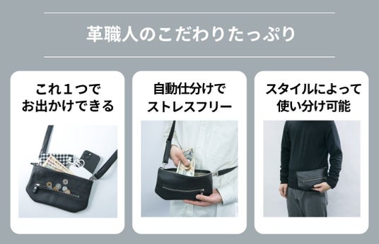 『MADE IN JAPANを世界へ!』を掲げる革職人のお店、新進工房(株式会社仙入 所在地:大阪府柏原市、代表:仙入 寛章)は、3月30日より、自動仕分け機能がある財布付きのサコッシュ「tri-トリ-」をクラウドファンディングサイトMakuakeにて、期間限定で販売開始しました。