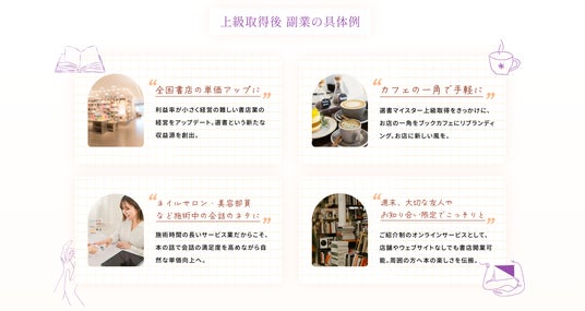選書は本にまつわる職種の方だけでなく、カフェ・美容サロン・個人向けサービスなど、さまざまな業種で応用が可能です。上級資格を取得すれば、チャプターズ公認の選書マイスターとして活動でき、現在の事業の顧客満足度向上や、差別化、単価アップを見込めます。